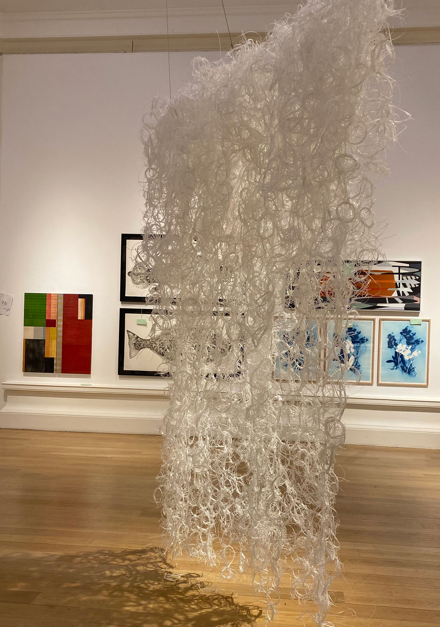 Having explored several forms of single use and recycled plastic I chose to work with plastic bailing tape, a hard and somewhat unforgiving material. A plentiful supply was provided by my local shops and supermarkets and through a series of experiments and sampling I began to discover its beauty and potential as a creative medium.